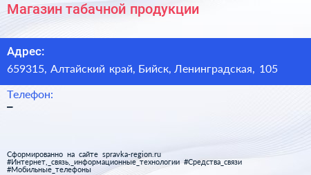Магазин табачной продукции по адресу 659315, Алтайский край, Бийск, Ленинградская, 105 в дальнейшем Организация, размещена в следующих категориях: