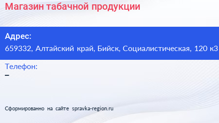 Магазин табачной продукции по адресу 659332, Алтайский край, Бийск, Социалистическая, 120 к3 в дальнейшем Организация, размещена в следующих категориях: