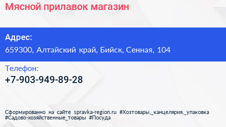 Мясной прилавок, магазин по адресу 659300, Алтайский край, Бийск, Сенная, 104 в дальнейшем Организация, размещена в следующих категориях: