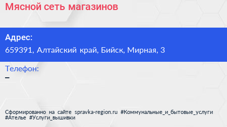 Мясной, сеть магазинов по адресу 659391, Алтайский край, Бийск, Мирная, 3 в дальнейшем Организация, размещена в следующих категориях: