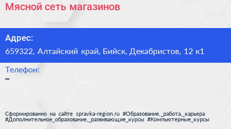 Мясной, сеть магазинов по адресу 659322, Алтайский край, Бийск, Декабристов, 12 к1 в дальнейшем Организация, размещена в следующих категориях: