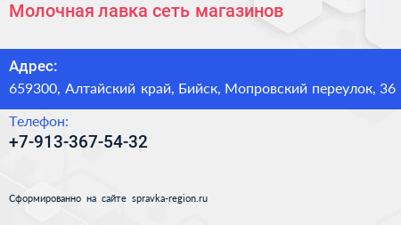 Молочная лавка, сеть магазинов по адресу 659300, Алтайский край, Бийск, Мопровский переулок, 36 в дальнейшем Организация, размещена в следующих категориях: