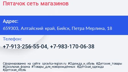 Пятачок, сеть магазинов по адресу 659303, Алтайский край, Бийск, Петра Мерлина, 18 в дальнейшем Организация, размещена в следующих категориях: