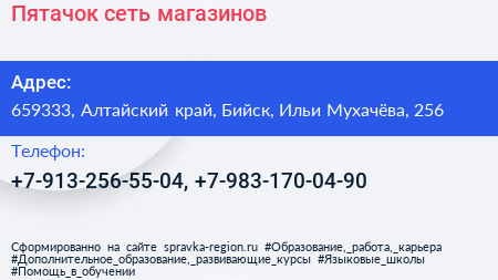 Пятачок, сеть магазинов по адресу 659333, Алтайский край, Бийск, Ильи Мухачёва, 256 в дальнейшем Организация, размещена в следующих категориях: