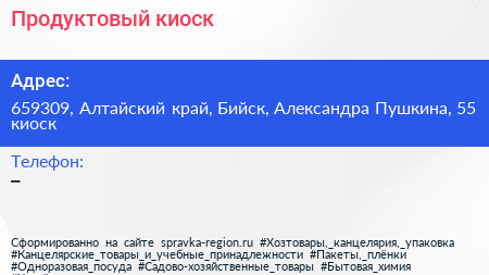 Продуктовый киоск по адресу 659309, Алтайский край, Бийск, Александра Пушкина, 55 киоск в дальнейшем Организация, размещена в следующих категориях: