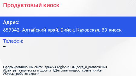Продуктовый киоск по адресу 659342, Алтайский край, Бийск, Каховская, 83 киоск в дальнейшем Организация, размещена в следующих категориях: