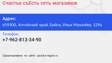 Счастье съЕсть, сеть магазинов по адресу 659300, Алтайский край, Бийск, Ильи Мухачёва, 129а в дальнейшем Организация, размещена в следующих категориях: