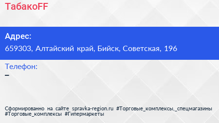 ТабакоFF по адресу 659303, Алтайский край, Бийск, Советская, 196 в дальнейшем Организация, размещена в следующих категориях: