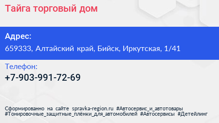 Тайга, торговый дом по адресу 659333, Алтайский край, Бийск, Иркутская, 1/41 в дальнейшем Организация, размещена в следующих категориях: