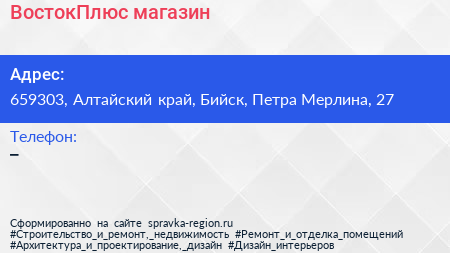 ВостокПлюс, магазин по адресу 659303, Алтайский край, Бийск, Петра Мерлина, 27 в дальнейшем Организация, размещена в следующих категориях: