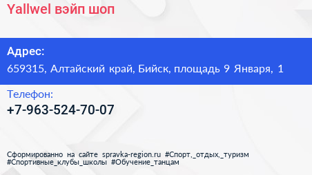 Yallwel, вэйп-шоп по адресу 659315, Алтайский край, Бийск, площадь 9 Января, 1 в дальнейшем Организация, размещена в следующих категориях: