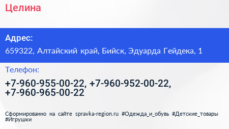 Целина по адресу 659322, Алтайский край, Бийск, Эдуарда Гейдека, 1 в дальнейшем Организация, размещена в следующих категориях: