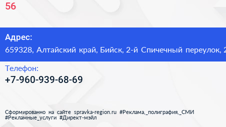 №56 по адресу 659328, Алтайский край, Бийск, 2-й Спичечный переулок, 2 в дальнейшем Организация, размещена в следующих категориях: