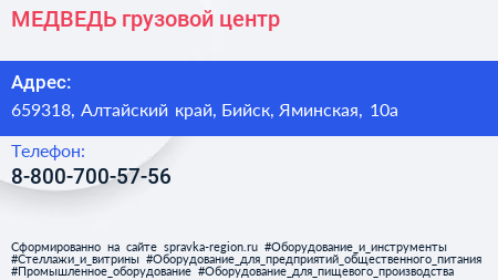 МЕДВЕДЬ, грузовой центр по адресу 659318, Алтайский край, Бийск, Яминская, 10а в дальнейшем Организация, размещена в следующих категориях: