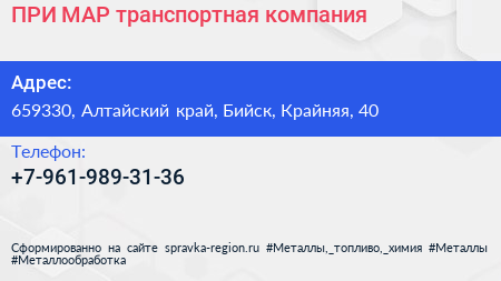 ПРИ-МАР, транспортная компания по адресу 659330, Алтайский край, Бийск, Крайняя, 40 в дальнейшем Организация, размещена в следующих категориях: