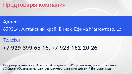 Продтовары, компания по адресу 659314, Алтайский край, Бийск, Ефима Мамонтова, 1а в дальнейшем Организация, размещена в следующих категориях: