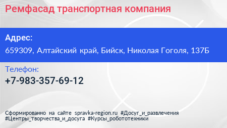 Ремфасад, транспортная компания по адресу 659309, Алтайский край, Бийск, Николая Гоголя, 137Б в дальнейшем Организация, размещена в следующих категориях: