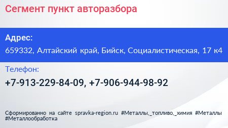 Сегмент, пункт авторазбора по адресу 659332, Алтайский край, Бийск, Социалистическая, 17 к4 в дальнейшем Организация, размещена в следующих категориях: