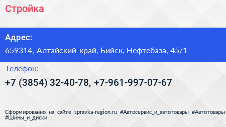 Для связи с организацией воспользуйтесь номером телефона: +7 (3854) 32-40-78, +7-961-997-07-67. Пн: c 08:00-17:00, Вт: c 08:00-17:00, Ср: c 08:00-17:00, Чт: c 08:00-17:00, Пт: c 08:00-17:00, Сб: c 08:00-17:00, Вс: выходной, вы можете обратиться в эту организацию.