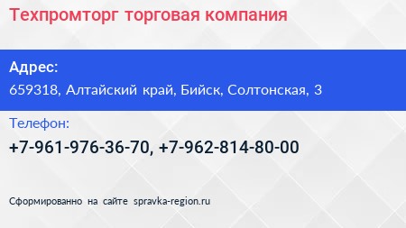 Техпромторг, торговая компания по адресу 659318, Алтайский край, Бийск, Солтонская, 3 в дальнейшем Организация, размещена в следующих категориях: