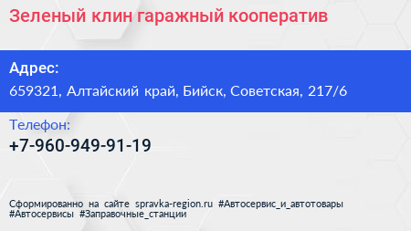 Зеленый клин, гаражный кооператив по адресу 659321, Алтайский край, Бийск, Советская, 217/6 в дальнейшем Организация, размещена в следующих категориях: