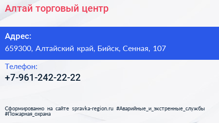 Алтай, торговый центр по адресу 659300, Алтайский край, Бийск, Сенная, 107 в дальнейшем Организация, размещена в следующих категориях: