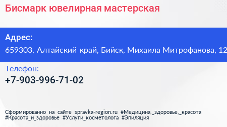Бисмарк, ювелирная мастерская по адресу 659303, Алтайский край, Бийск, Михаила Митрофанова, 12 в дальнейшем Организация, размещена в следующих категориях:
