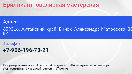 Бриллиант, ювелирная мастерская по адресу 659316, Алтайский край, Бийск, Александра Матросова, 30 к2 в дальнейшем Организация, размещена в следующих категориях:
