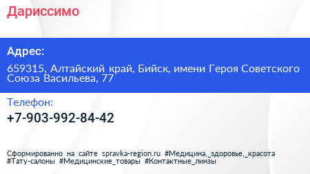 Дариссимо по адресу 659315, Алтайский край, Бийск, имени Героя Советского Союза Васильева, 77 в дальнейшем Организация, размещена в следующих категориях: