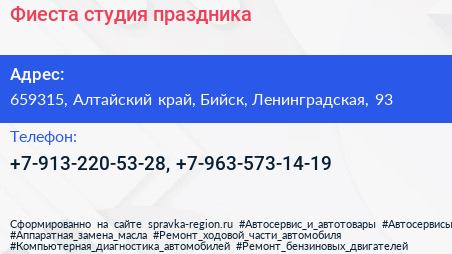 Фиеста, студия праздника по адресу 659315, Алтайский край, Бийск, Ленинградская, 93 в дальнейшем Организация, размещена в следующих категориях: