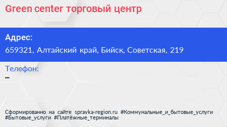 Green center, торговый центр по адресу 659321, Алтайский край, Бийск, Советская, 219 в дальнейшем Организация, размещена в следующих категориях: