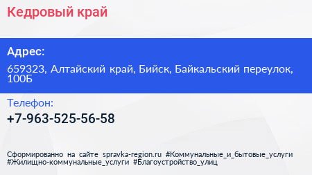 Кедровый край по адресу 659323, Алтайский край, Бийск, Байкальский переулок, 100Б в дальнейшем Организация, размещена в следующих категориях: