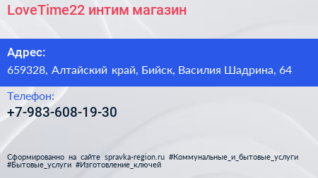 LoveTime22, интим-магазин по адресу 659328, Алтайский край, Бийск, Василия Шадрина, 64 в дальнейшем Организация, размещена в следующих категориях: