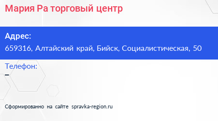 Мария-Ра, торговый центр по адресу 659316, Алтайский край, Бийск, Социалистическая, 50 в дальнейшем Организация, размещена в следующих категориях: