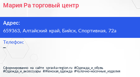 Мария-Ра, торговый центр по адресу 659363, Алтайский край, Бийск, Спортивная, 72а в дальнейшем Организация, размещена в следующих категориях:
