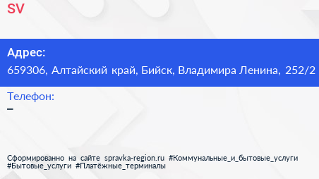 SV по адресу 659306, Алтайский край, Бийск, Владимира Ленина, 252/2 в дальнейшем Организация, размещена в следующих категориях: