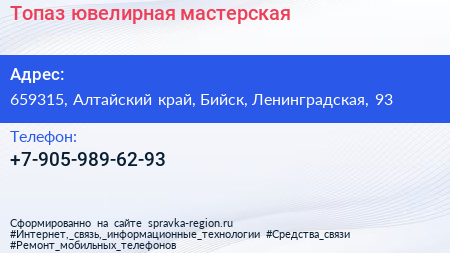 Топаз, ювелирная мастерская по адресу 659315, Алтайский край, Бийск, Ленинградская, 93 в дальнейшем Организация, размещена в следующих категориях: