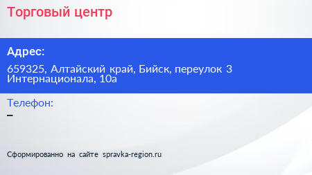 Торговый центр по адресу 659325, Алтайский край, Бийск, переулок 3 Интернационала, 10а в дальнейшем Организация, размещена в следующих категориях: