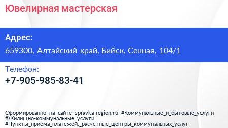 Ювелирная мастерская по адресу 659300, Алтайский край, Бийск, Сенная, 104/1 в дальнейшем Организация, размещена в следующих категориях: