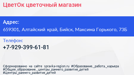 ЦветОк, цветочный магазин по адресу 659301, Алтайский край, Бийск, Максима Горького, 73Б в дальнейшем Организация, размещена в следующих категориях: