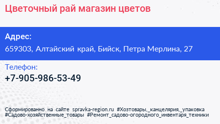 Цветочный рай, магазин цветов по адресу 659303, Алтайский край, Бийск, Петра Мерлина, 27 в дальнейшем Организация, размещена в следующих категориях: