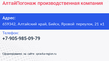 АлтайПогонаж, производственная компания по адресу 659342, Алтайский край, Бийск, Яровой переулок, 21 к1 в дальнейшем Организация, размещена в следующих категориях: