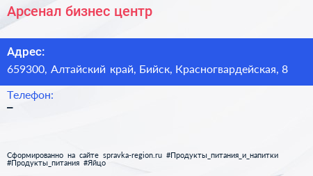 Арсенал, бизнес-центр по адресу 659300, Алтайский край, Бийск, Красногвардейская, 8 в дальнейшем Организация, размещена в следующих категориях: