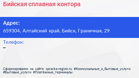 Бийская сплавная контора по адресу 659304, Алтайский край, Бийск, Граничная, 29 в дальнейшем Организация, размещена в следующих категориях: