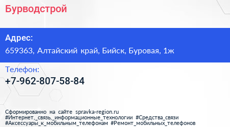 Бурводстрой по адресу 659363, Алтайский край, Бийск, Буровая, 1ж в дальнейшем Организация, размещена в следующих категориях: