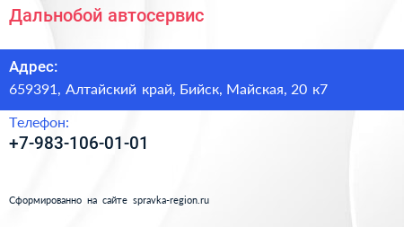 Дальнобой, автосервис по адресу 659391, Алтайский край, Бийск, Майская, 20 к7 в дальнейшем Организация, размещена в следующих категориях: