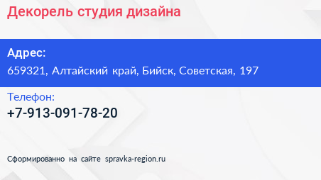 Декорель, студия дизайна по адресу 659321, Алтайский край, Бийск, Советская, 197 в дальнейшем Организация, размещена в следующих категориях: