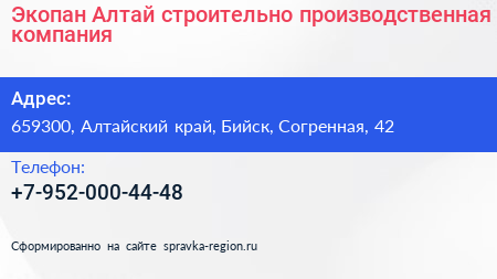 Экопан-Алтай, строительно-производственная компания по адресу 659300, Алтайский край, Бийск, Согренная, 42 в дальнейшем Организация, размещена в следующих категориях: