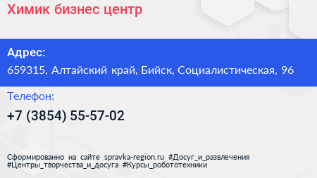 Химик, бизнес-центр по адресу 659315, Алтайский край, Бийск, Социалистическая, 96 в дальнейшем Организация, размещена в следующих категориях: