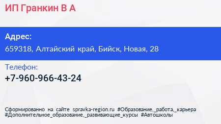 ИП Гранкин В.А. по адресу 659318, Алтайский край, Бийск, Новая, 28 в дальнейшем Организация, размещена в следующих категориях: